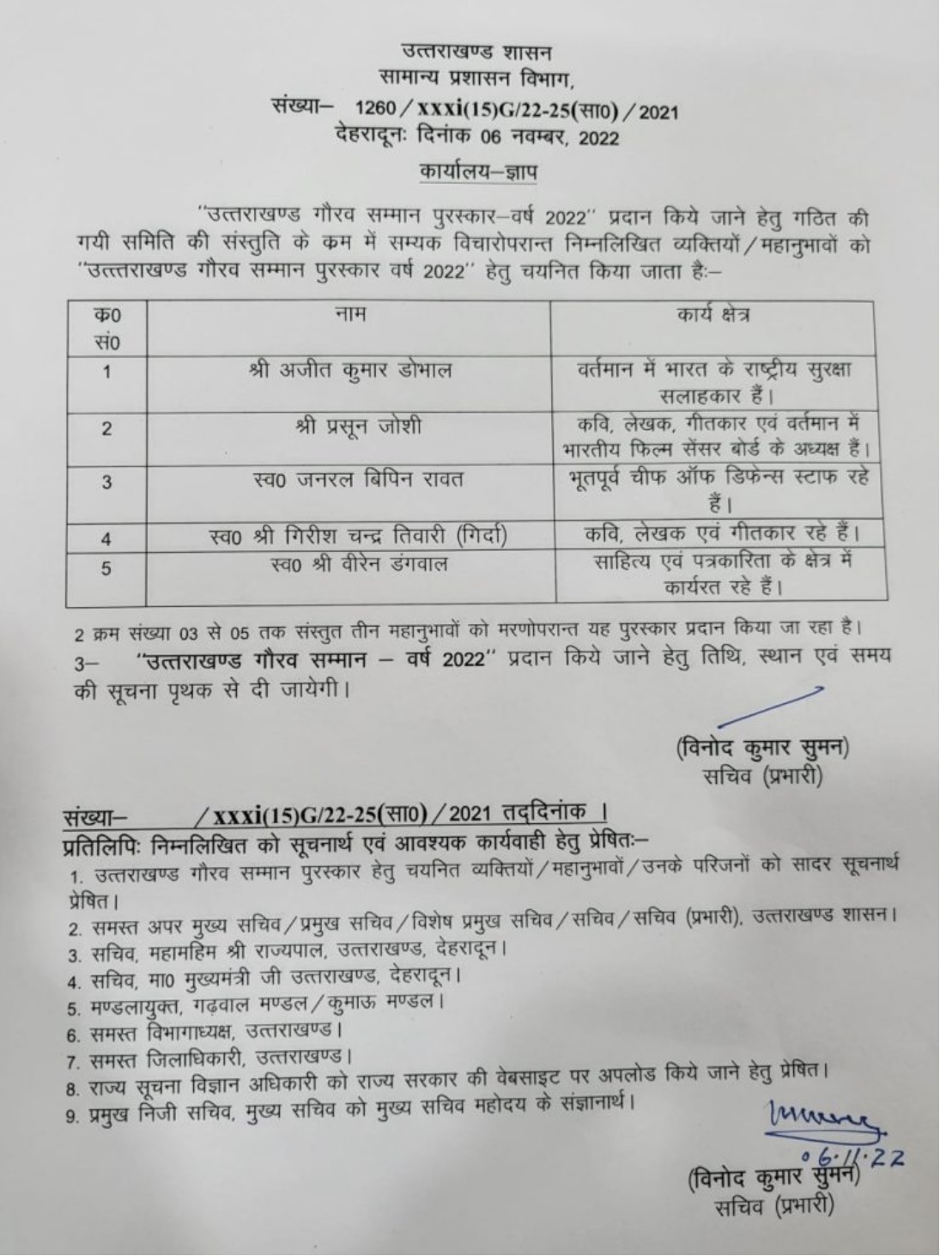 उत्तराखंड गौरव सम्मान पुरस्कार वर्ष 2022 के लिए समिति द्वारा पहाड़ की पांच हस्तियों को चुना गया है। जिनमें भारत के राष्ट्रीय सुरक्षा सलाहकार अजीत डोबल, कवि लेखक गीतकार एवं वर्तमान में भारतीय फिल्म सेंसर बोर्ड के अध्यक्ष प्रसून जोशी तथा पूर्व चीफ ऑफ डिफेंस स्टाफ स्वर्गीय जनरल बिपिन रावत और कवि लेखक और गीतकार स्वर्गीय गिरीशचंद्र तिवारी गिर्दा तथा साहित्य पत्रकारिता क्षेत्र में स्वर्गीय श्री वीरेन डंगवाल हैं ।