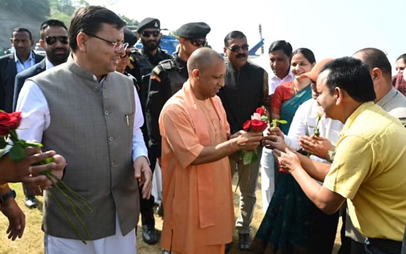 मध्य क्षेत्रीय परिषद बैठक में शामिल होने पहुंचे सीएम योगी के साथ सीएम धामी