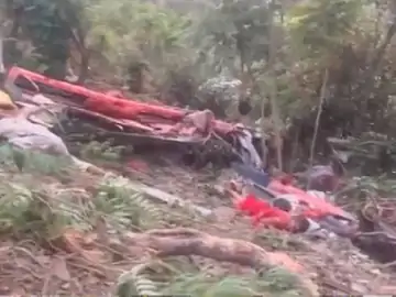 #WATCH | Uttarakhand: Visuals from the gorge in Uttarkashi district where a bus carrying 28 pilgrims fell down. 22 pilgrims have died & 6 people have been injured. Local administration & SDRF teams engaged in rescue work; NDRF team rushing to spot. pic.twitter.com/g0KDBRdDMe