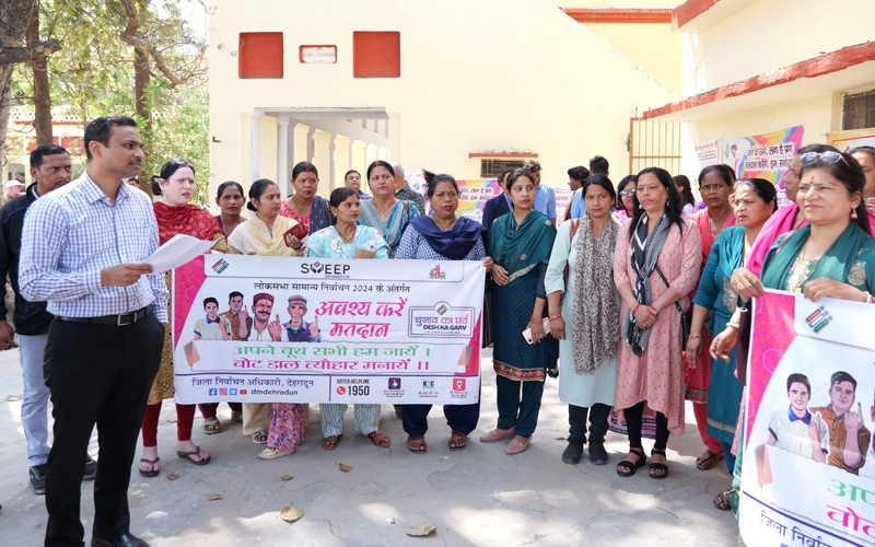 देहरादून – मुख्य निर्वाचन अधिकारी डॉ. बी.वी.आर.सी पुरुषोत्तम के निर्देशों के क्रम में निर्वाचन कार्यालय में तैनात वरिष्ठ अधिकारियों द्वारा राजधानी देहरादून में कम मतदान प्रतिशत वाले बूथों पर मतदाता शपथ आयोजित कर जनजागरुकता कार्यक्रम में प्रतिभाग किया गया। इसी क्रम में अपर मुख्य निर्वाचन अधिकारी डॉ. विजय कुमार जोगदंडे ने डीएवी कॉलेज, देहरादून में जाकर मतदाता शपथ एवं जन जागरूकता कार्यक्रम में प्रतिभाग किया। संयुक्त मुख्य निर्वाचन अधिकारी नमामि बंसल ने रितिका चिल्ड्रन एकेडमी, केदारपुरम व दून यूनिवर्सिटी, संयुक्त मुख्य निर्वाचन अधिकारी प्रताप शाह ने लक्खीबाग स्थित प्राइमरी विद्यालय व उप मुख्य निर्वाचन अधिकारी सुश्री मुक्ता मिश्र ने उच्च प्राथमिक विद्यालय राजीवनगर में आयोजित कार्यक्रम में प्रतिभाग किया।