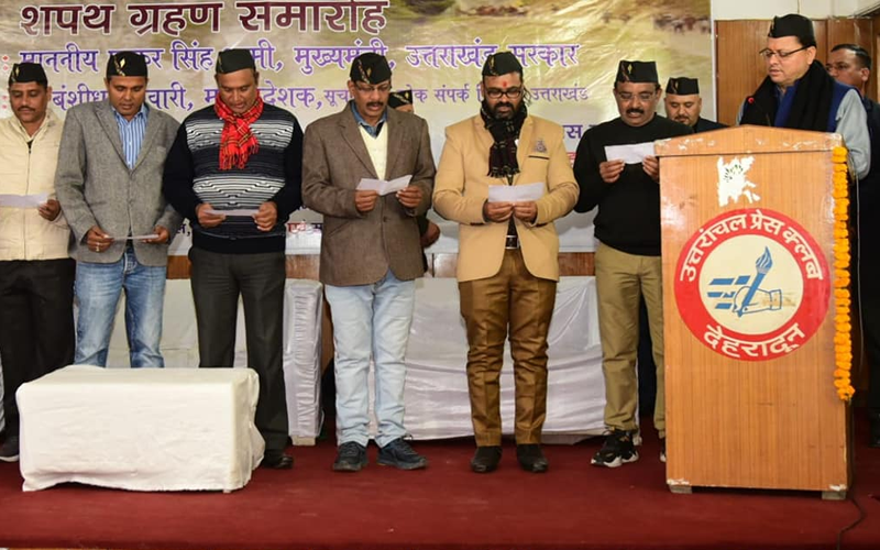 देहरादून – मुख्यमंत्री पुष्कर सिंह धामी ने आज देहरादून में उत्तरांचल प्रेस क्लब की नवनिर्वाचित कार्यकारणी के शपथ ग्रहण समारोह में प्रतिभाग करते हुए कार्यकारणी सदस्यों को शपथ दिलवाई। मुख्यमंत्री ने कहा कि उत्तरांचल प्रेस क्लब के भवन निर्माण, अतिथि गृह व पुस्तकालय निर्माण कार्य जल्द शुरू हो सकें, इसके लिए उच्च स्तर पर सूचना महानिदेशक बंशीधर तिवारी द्वारा कार्यवाही की जाएगी। उन्होंने कहा कि राज्य निर्माण आन्दोलन के दौरान सक्रिय रहे पत्रकारों को भी आजीवन स्थाई मान्यता दिये जाने के संबंध में कमेटी का गठन किया जाएगा साथ ही पत्रकारों के लिए भी यू हेल्थ कार्ड बनाने की दिशा में कार्य किए जाएंगे।
