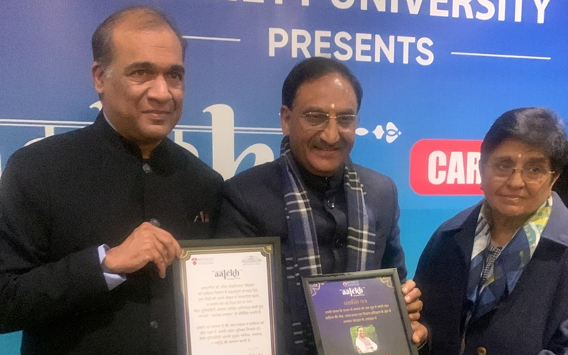 देहरादून – आज नई दिल्ली में टाइम्ज़ समूह के बेनेट विश्वविद्यालय में नवोदित लेखकों को प्रोत्साहित करने हेतु आलेख 2023 का आयोजन किया गया ।इस अवसर पर हिंदी के प्रख्यात कवि, साहित्यकार एवं भारत सरकार के पूर्व शिक्षा मंत्री डॉ. रमेश पोखरियाल “निशंक” को उनके उत्कृष्ट साहित्य सृजन और साहित्य के माध्यम से युवा पीढ़ी को प्रोत्साहित करने हेतु आलेख शिखर सम्मान से सम्मानित किया गया।आलेख अभियान के द्वारा विश्वविद्यालय आकांक्षी लेखकों को प्रोत्साहित कर उन्हें लेखन के गुर सीखकर नयी उंचाईया प्रदान करेगा। आलेख अभियान युवाओं  के अंदर लिखने की प्रतिभा को पहचान कर उन्हें बेहतर लेखन के लिए प्रोत्साहित कर उन्हें पुस्तक प्रकाशन में सहायता प्रदान करेगा।लिखने पढ़ने और विश्लेषण करने की क्षमता विकास को समर्पित यह अभियान युवाओं में संवेदनशीलता को उजागर कर उन्हें बेहतर नागरिक बनाने को कोशिश करेगा। लिखने की ताक़त, पुस्तकों का प्रभाव और सृजन क्षमता की महत्ता को समर्पित यह टाइम्ज़ समूह की पहल का पूरे देश में अनुकरण होगा।