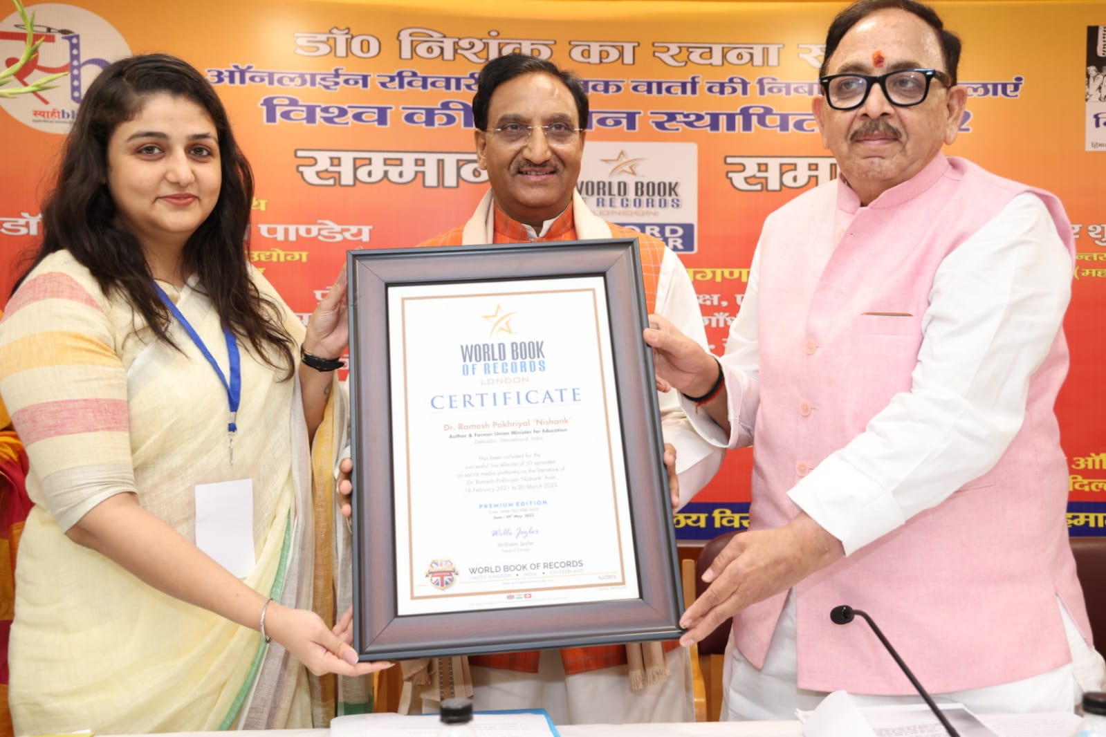 आज नई दिल्ली , वर्ल्ड बुक ऑफ रिकॉर्ड लंदन एवं हिमालय विरासत ट्रस्ट के तत्वाधान में आयोजित कार्यक्रम में डॉ निशंक के रचना संसार पर ऑनलाइन वेबीनार की निर्बाध श्रृंखला के लिए कीर्तिमान स्थापित होने पर सम्मान समारोह आयोजित किया गया।