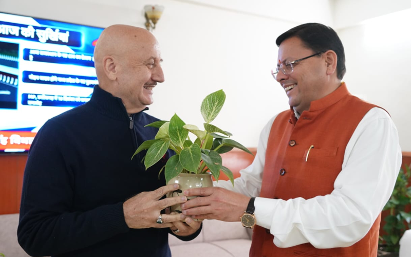देहरादून- मुख्यमंत्री पुष्कर सिंह धामी से अपनी अद्वितीय अभिनय कला से सिनेमा जगत को नए आयाम देने वाले, भारतीय फिल्म और टेलीविजन संस्थान के पूर्व अध्यक्ष एवं प्रसिद्ध अभिनेता अनुपम खेर ने सचिवालय में भेंट की।इस अवसर पर अभिनेता अनुपम खेर ने मुख्यमंत्री पुष्कर सिंह धामी से डेस्टिनेशन उत्तराखण्ड के तहत देवभूमि में फ़िल्म शूटिंग की सम्भावनाओं को साकार करने के लिए प्रदेश सरकार द्वारा लागू की गई नई फ़िल्म नीति पर भी विचार-विमर्श किया।
