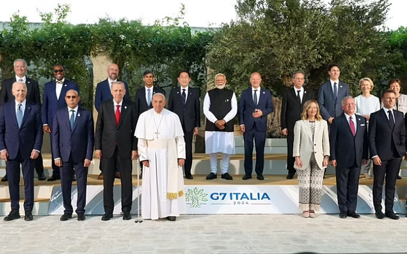 नई दिल्ली – जी7 शिखर सम्मेलन के ‘आउटरीच नेशन’ सत्र में दुनिया भर के नेताओं ने एक साथ फोटो खिंचवाई। जी7 शिखर सम्मेलन के दूसरे दिन प्रधानमंत्री नरेंद्र मोदी ने वैश्विक नेताओं से मुलाकात की।प्रधानमंत्री ने सभी देशों के साथ कई अहम मुद्दों पर चर्चा की।प्रधानमंत्री मोदी ने जी-7 शिखर सम्मेलन के दूसरे दिन ब्राजील के राष्ट्रपति लुइज इंसियो लूला दा सिल्वा, तुर्की के राष्ट्रपति रजब तैयब इरदुगान और यूएई के राष्ट्रपति मोहम्मद बिन जायद अल नाहयान से मुलाकात की।