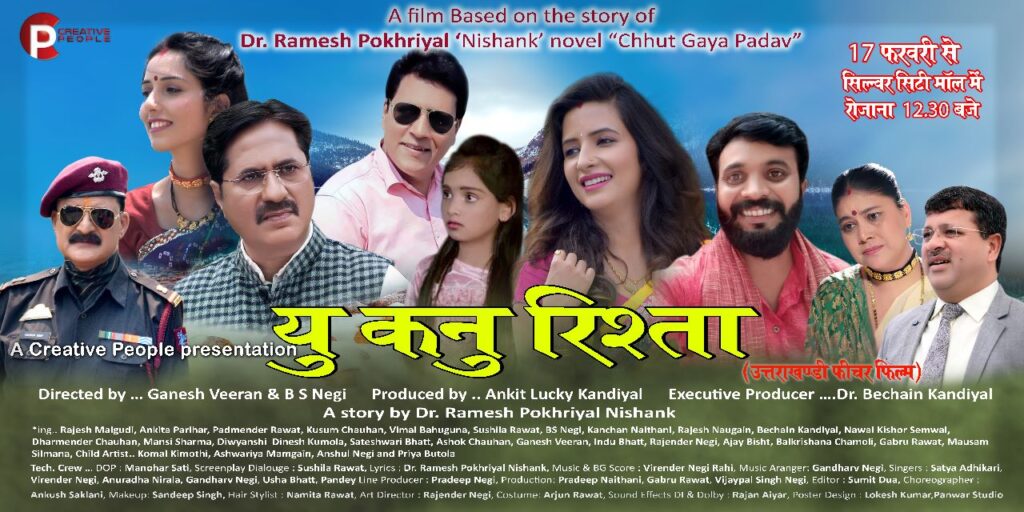 देहरादून: –पूर्व केन्द्रीय मंत्री डॉ. रमेश पोखरियाल ‘निशंक’ के उपन्यास पर बनी गढ़वाली फिल्म “यू कनु रिश्ता” देहरादून की सिल्वर सिटी सिनेमा में दिनांक 17 फरवरी 2023 से प्रदर्शित की जाएगी।