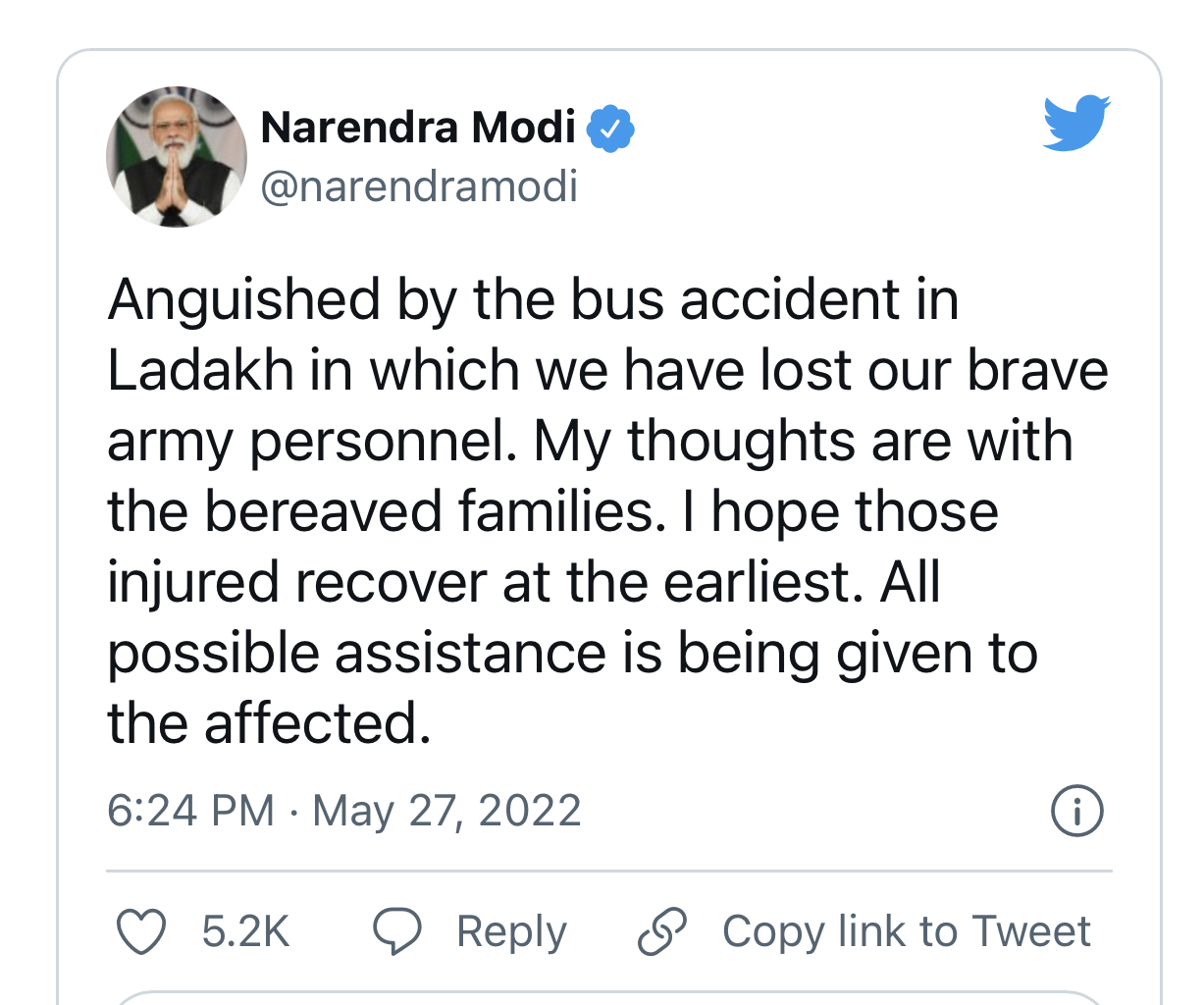 लद्दाख़ में हुए हादसे में पीएम मोदी ने दुख जताते हुए कहा कि बस हादसे से आहत हूं, जिसमें हमने अपने सेना के वीर जवानों को खो दिया है. मेरी संवेदनाएं शोककुल परिवारों के साथ हैं. मुझे उम्मीद है कि जो घायल हुए हैं वे जल्द से जल्द ठीक हो जाएंगे. प्रभावितों को हर संभव सहायता दी जा रही है.