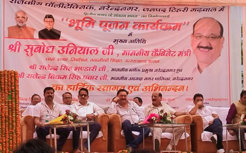नरेन्द्र नगर – नाबार्ड योजना के अन्तर्गत राजकीय पॉलीटेक्निक नरेन्द्र नगर में द्वितीय फेज निर्माण कार्यो एवं डिजिटल लाइब्रेरी का भूमि पूजन कार्यक्रम आयोजित किया गया, जिसमें वन, भाषा, निर्वाचन एवं तकनीकी शिक्षा मंत्री सुबोध उनियाल, ब्लॉक प्रमुख नरेन्द्रनगर राजेन्द्र सिंह भण्डारी, नगरपालिका अध्यक्ष नरेन्द्रनगर राजेन्द्र विक्रम सिंह पंवार, निदेशक प्राविधिक शिक्षा आरपी गुप्ता, परीक्षा नियंत्रक प्राविधिक शिक्षा परिषद् डॉ. मुकेश पाण्डेय, कार्यदायी संस्था के सीजीएम सीएस रजवाण, प्रोजेक्ट मैनेजर अरविन्द सजवाण, संस्था प्रधानाचार्य आलोक मिश्रा की उपस्थिति में हुआ ।इस अवसर पर तकनीकी शिक्षा मंत्री सुबोध उनियाल द्वारा प्रदेश एवं देश के विकास हेतु छात्र शक्ति का आह्वान किया गया । उनके द्वारा छात्रों को अनुशासित जीवन जीने हेतु तथा अपने कर्तव्यों का पालन करने हेतु निर्देश दिये गये । तकनीकी शिक्षा मंत्री सुबोध उनियाल द्वारा नरेन्द्रनगर पॉलीटेक्निक के द्वितीय चरण के निर्माण कार्यो एवं डिजिटल लाइब्रेरी का भूमि पूजन किया जाना अपना सौभाग्य बताया गया । मंत्री जी द्वारा बताया गया कि 1975 में स्थापित इस पॉलीटेक्निक में वर्तमान में 07 पाठ्यक्रमों में डिप्लोमा कोर्स चला रहा है एवं प्रदेश के 71 संस्थाओं में ब्रांचवार/प्रवेश क्षमतावार पॉचवें स्थान पर है तथा 71 पॉलीटेक्निक में 03 पॉलीटेक्निक नरेन्द्र नगर विधानसभा के अन्तर्गत आते हैं ।