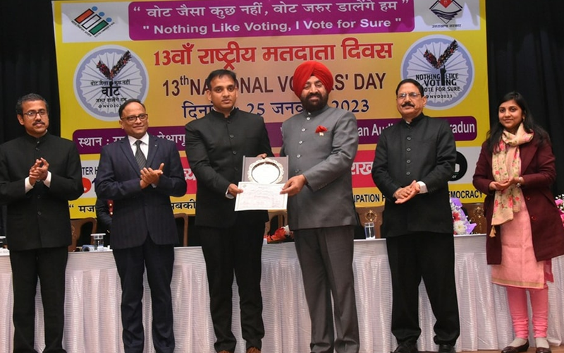 देहरादून – राष्ट्रीय मतदाता दिवस के अवसर पर राज्यपाल लेफ्टिनेंट जनरल गुरमीत सिंह (से.नि) ने राजभवन में प्रथम बार मतदाता बनने वाले युवाओं को मतदाता बैज व पहचान पत्र प्रदान कर सम्मानित किया। इस अवसर पर उन्होंने जागरूकता हेतु निर्वाचन आइकॉन पद्मश्री कल्याण सिंह रावत व प्रीतम भरतवाण को सम्मानित किया।