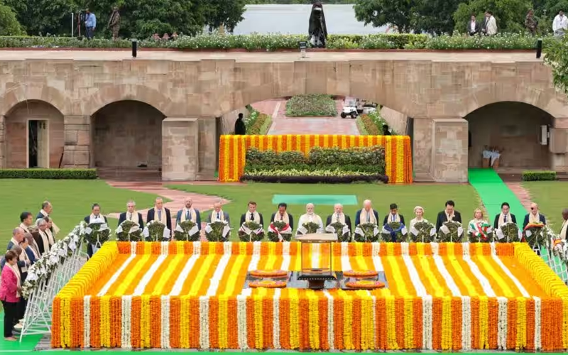नई दिल्ली – प्रधानमंत्री नरेन्द्र मोदी ने जी20 के सदस्य राष्ट्रों के नेताओं के साथ आज ऐतिहासिक राजघाट पर महात्मा गांधी को श्रद्धांजलि अर्पित की। उन्होंने इस तथ्य को रेखांकित किया कि गांधी जी के शाश्वत आदर्श एक सामंजस्यपूर्ण, समावेशी एवं समृद्ध वैश्विक भविष्य के सामूहिक दृष्टिकोण का मार्गदर्शन करते हैं।“ऐतिहासिक राजघाट पर, जी20 परिवार ने शांति, सेवा, करुणा और अहिंसा के प्रतीक महात्मा गांधी को श्रद्धांजलि अर्पित की।
