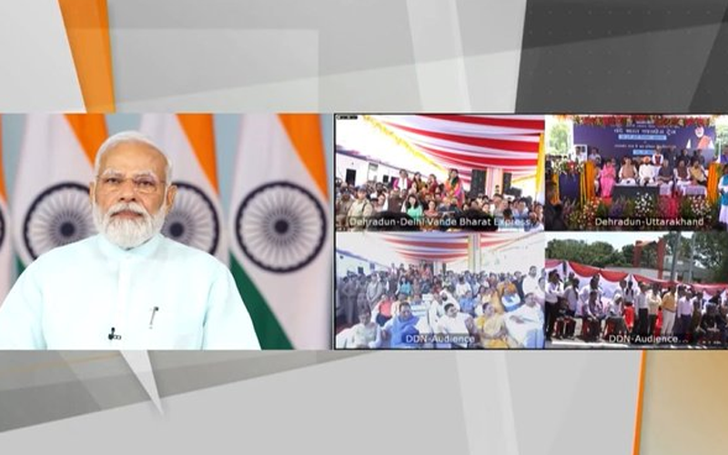 देहरादून – प्रधानमंत्री नरेन्द्र मोदी ने आज वीडियो कॉन्फ्रेंसिंग के माध्यम से देहरादून से दिल्ली के लिए पहली वंदे भारत एक्सप्रेस को हरी झंडी दिखाकर रवाना किया। प्रधानमंत्री नरेंद्र मोदी ने दिल्ली और देहरादून के बीच ये चलने वाली वंदे भारत एक्सप्रेस ट्रेन देश की राजधानी को और तेज गति से जोड़ेगी। इस ट्रेन से दिल्ली और देहरादून के बीच रेल सफर में अब समय काफी कम हो जाएगा। ट्रेन में जो सुविधाएं हैं वो इस सफर को आनंद दायक बनाने वाली हैlट्रेन शुरू होने से राज्य में आने वाले यात्रियों के लिए फायदेमंद होगा। वंदे भारत भारत के सामान्य परिवारों की पहली पसंद बनती जा रही है। प्रधानमंत्री नरेंद्र मोदी ने कहा कि अभी कुछ घंटे पहले ही मैं तीन देशों की यात्रा करके आया हूं आज पूरा विश्व भारत को उम्मीदों से देख रहा है। हमने जिस तरह अपनी अर्थव्यवस्था को मजबूती दी है, जिस तरह हम गरीबी से लड़ रहे हैं उसने पूरी दुनिया का विश्वास जगा दिया है।