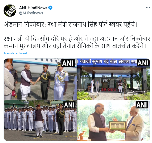 रक्षा मंत्री राजनाथ सिंह अपने दो दिवसीय दौरे पर पोर्ट ब्लेयर पहुंचे। यहां उन्होंने अंडमान और निकोबार में तैनात सैनिकों को संबोधित करते हुए कहा कि अंडमान निकोबार कमान ने हमारी राष्ट्रीय सुरक्षा को मजबूत करने, और हमारे समुद्री क्षेत्र को सुरक्षित रखने में महत्वपूर्ण भूमिका निभाई है। 2001 में स्थापना के बाद से अंडमान निकोबार कमान ने अपनी परिचालन क्षमता में वृद्धि की है।