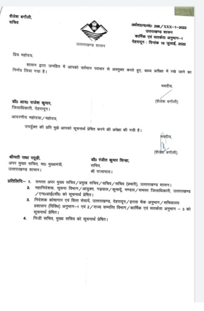 देहरादून जिला अधिकारी पद से हटाए गए आर राजेश कुमार के स्थान पर अपर सचिव सोनिका को देहरादून जिलाधिकारी की अतिरिक्त जिम्मेदारी सौंपी गई है ।