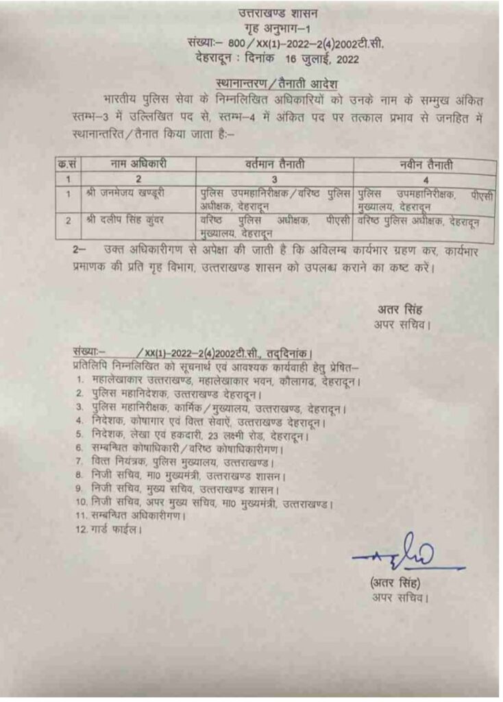 देहरादून के एसएसपी जन्मेजय खंडूरी को एसएसपी से हटाकर पुलिस उपमहानिरीक्षक, पीएसी की जिम्मेदारी दी गयी है ।