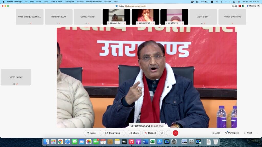 देहरादून: पूर्व मुख्यमंत्री व पूर्व केंद्रीय शिक्षा मंत्री डॉ रमेश पोखरियाल निशंक ने आज देहरादून से हल्द्वानी में आयोजित वर्चुअल पत्रकार वार्ता संबोधित करते हुए कहा कि प्रदेश की जनता भाजपा के ‘अबकी बार 60 पार’ की अपील पर मुहर लगाने वाली है । मौसम खराब होने के कारण वहां नहीं पाने पर खेद जताते हुए उन्होने विश्वास जताया कि लोग भाजपा द्धारा राज्य बनाने के लिए किए संघर्ष और उनकी पार्टी की सरकारों के विकास कार्यों को नहीं भूले हैं और न ही कॉंग्रेस पार्टी की राज्य निर्माण विरोधी सोच और उनकी सरकारों के कुशासन को ।