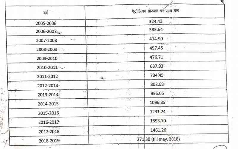 श्री नदीम को उपलब्ध टैक्स आंकड़ों के अनुसार 2007-08 में पेट्रोलियम पदार्थों पर सरकार को केवल 414.9 करोड़ टैक्स मिला था जोे 2007-08 में 414.9 करोड़, 2008-09 में 457.45 करोड़, 2009-10 में 476.71 करोड़, 2010-11 में 637.93 करोड़, 2011-12 में 734.45 करोड़, 2012-13 में 802.68 करोड़, 2013-14 में 996.05 करोड़ 2014-15 में 1096.35 करोड़, 2015-16 में 1231.24 करोड़ 2016-17 में 1393.7 करोड़, 2017-18 में 1461.26 करोड़, 2018-19 में 1599.92 करोड़ हो गया, लेकिन कोरोना महामारी शुरू होने पर 2019-20 में इसमें 88.13 करोड़ की कमी होकर 1511.79 करोड़ ही रह गया। 2020-21 में यह 1517.7 करोड़ 2021-22 में 2007-08 की तुलना में 352.15 प्रतिशत बढ़कर 1875.99 करोड़ तथा 2022-23 में जनवरी 2023 तक 1758.49 करोड़ रूपये टैक्स मिला हैै।